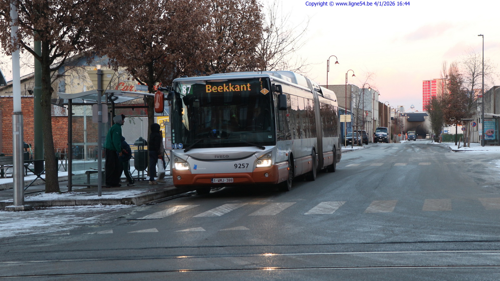 1114. Le 4/1/2026, l'Iveco Urbanway 18 Hybrid n°9257 de la STIB sur la ligne 87 vers Beekkant dessert la gare de Berchem-Sainte-Agathe.