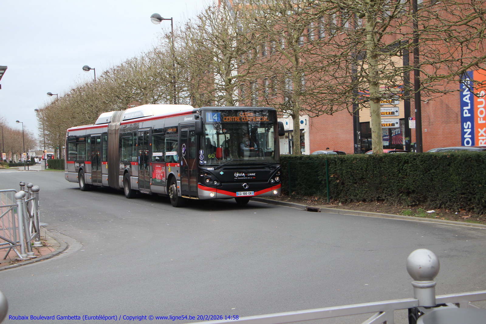 1121. Op 20/2/2026 verlaat de Irisbus Citelis 18 NGV nr. 8683 van Ilevia op lijn L4 naar Leers Centre Commercial het busstation van Roubaix Eurotéléport.