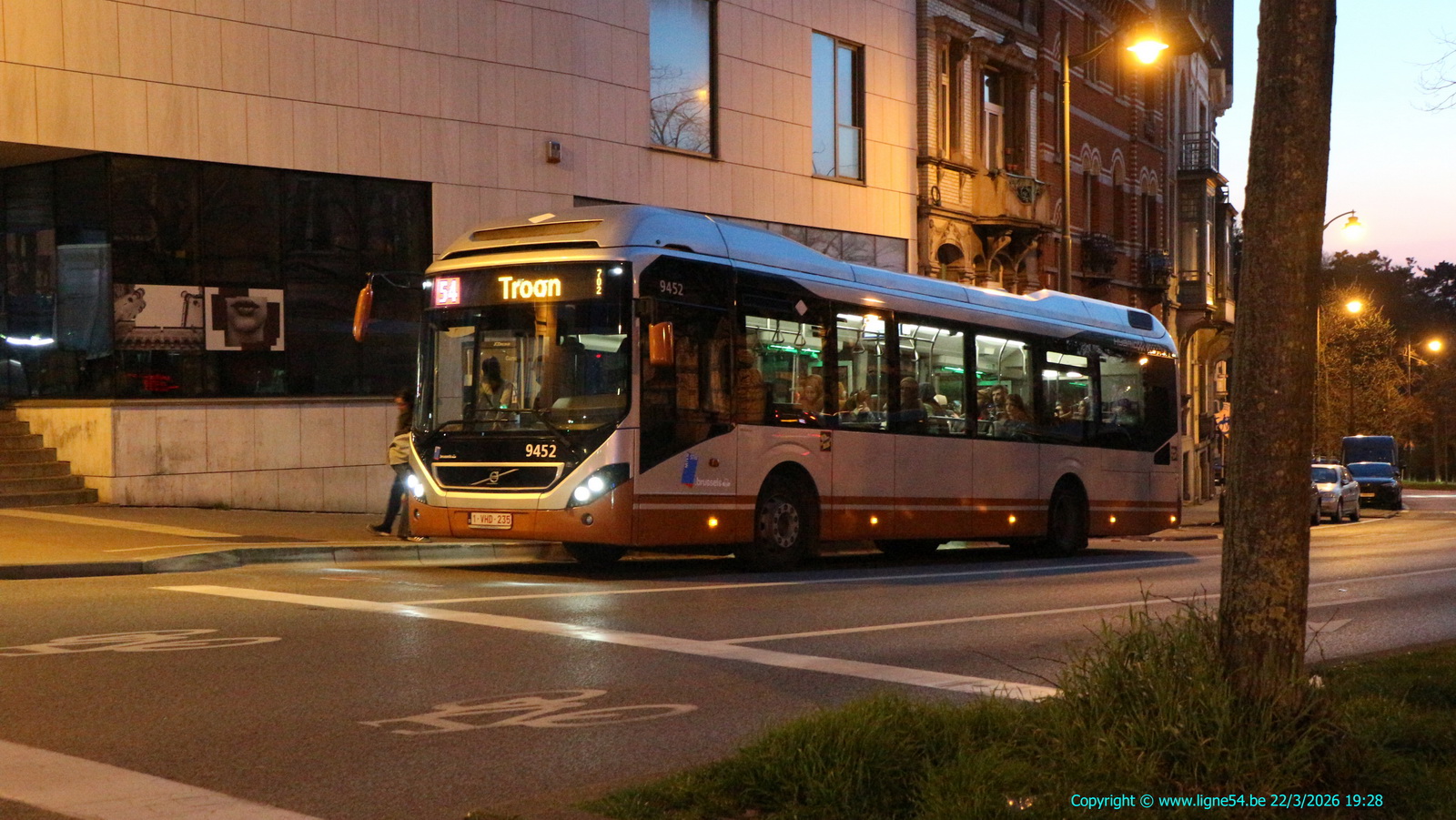 1125. Op 22/3/2026 bedient de Volvo 7900 Hybrid nr.9452 op lijn 54 naar Troon de halte Albert in Vorst.
