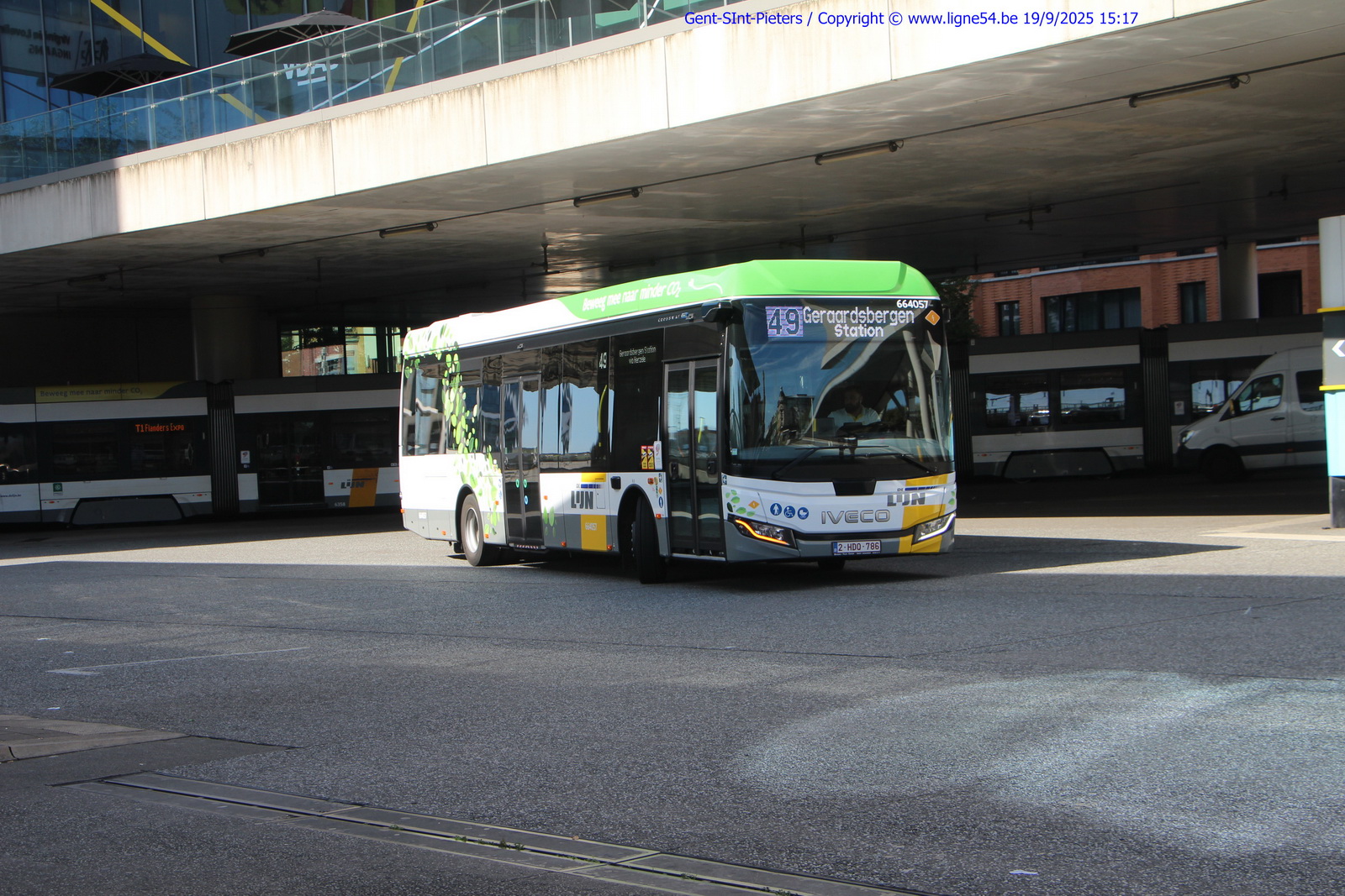 1099. Op 19/9/2025 rijdt de Iveco Crossway LE Elec nr. 664057 van pachter Sylvae Tours op lijn 49 naar Geraardsbergen Station naar zijn vertrekhalte in Gent-Sint-Pieters.