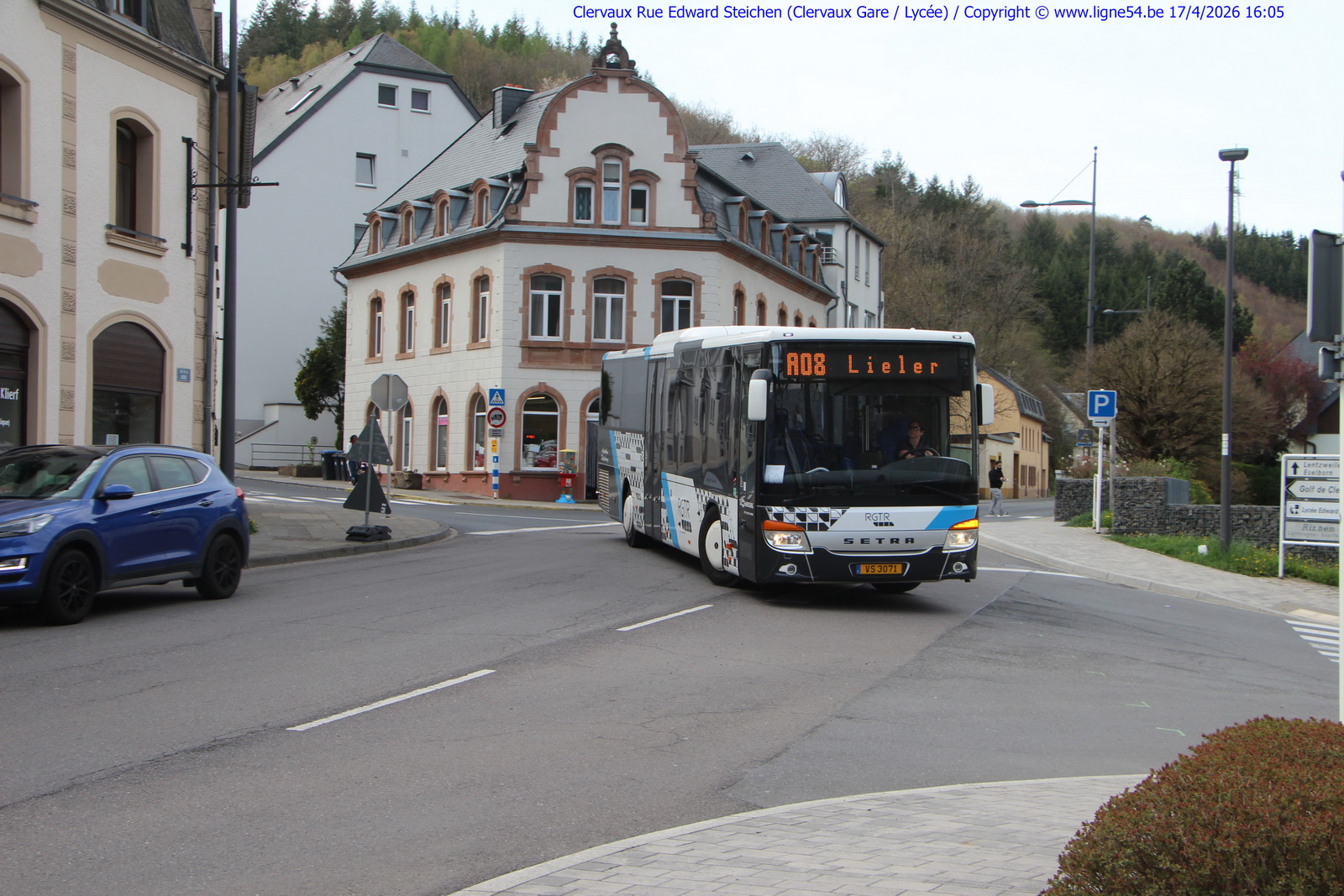 1129. Op 17/4/2026 rijdt de Setra S416LE Business VS3071 van autocarist Autobus Stephany op de schoolbuslijn A08 naar Lieler naar het station van Clervaux.