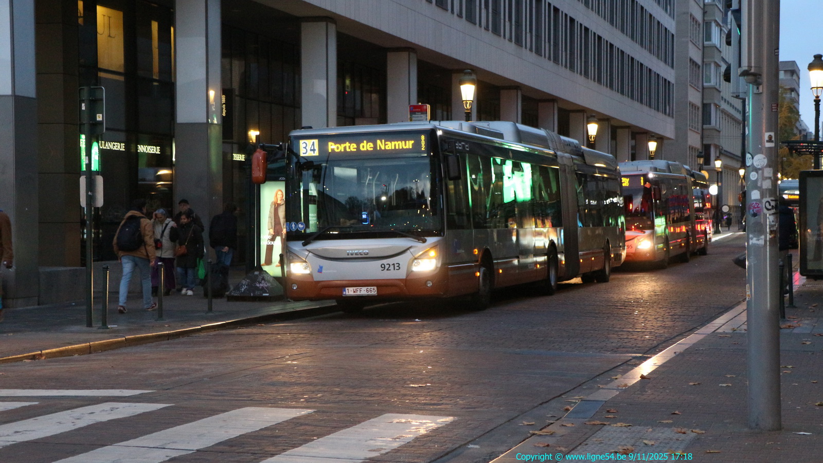 1106. Le 9/11/2025, l'Iveco Urbanway 18 Hybrid n°9213 de la STIB sur la ligne 34 vers Porte de Namur dessert l'arrêt Trône à Bruxelles.