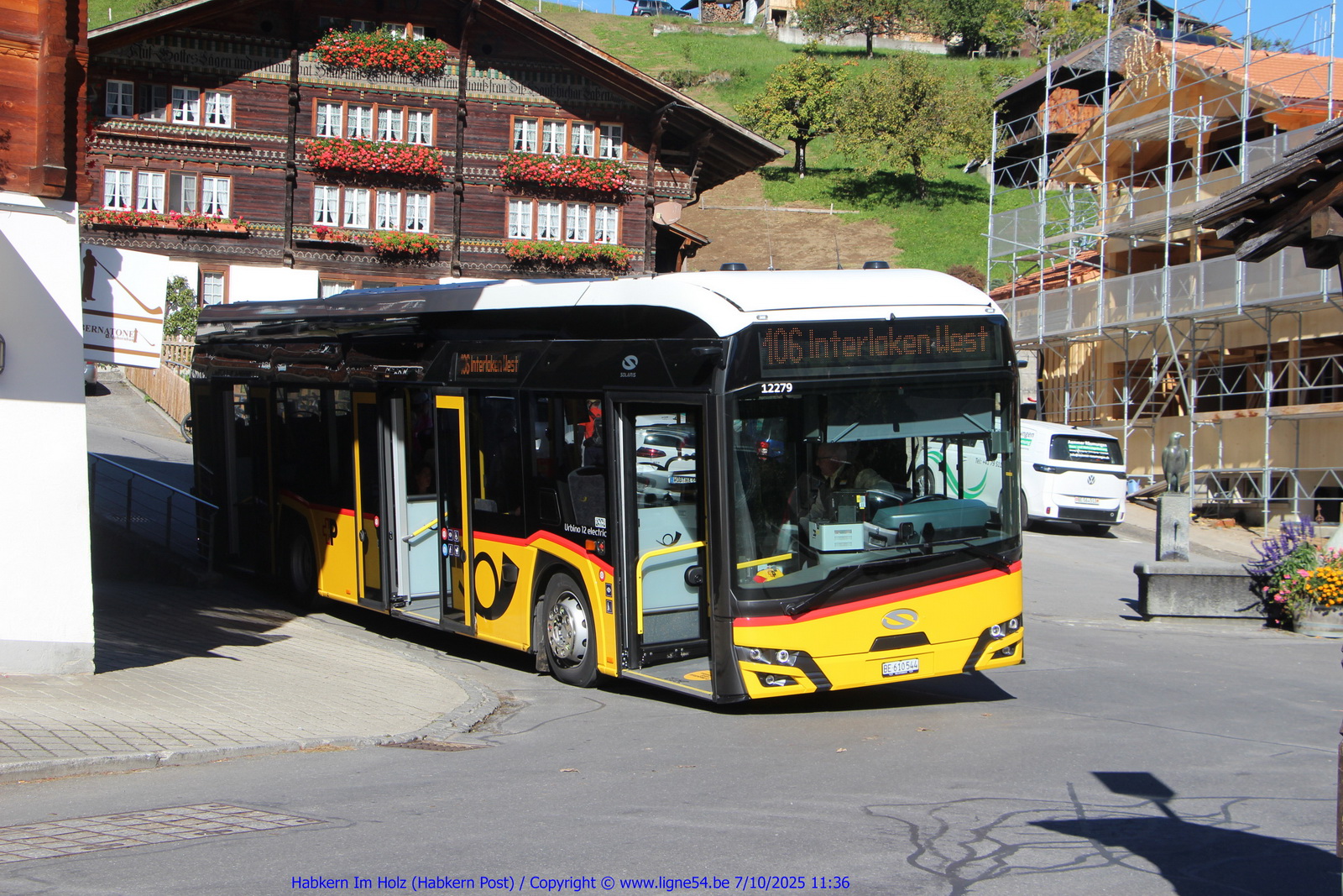 1101. Op 7/10/2025 bedient de Solaris Urbino 12 IV Electric nr. 12279 van Postauto op lijn 106 naar Interlaken West het dorp Habkern.