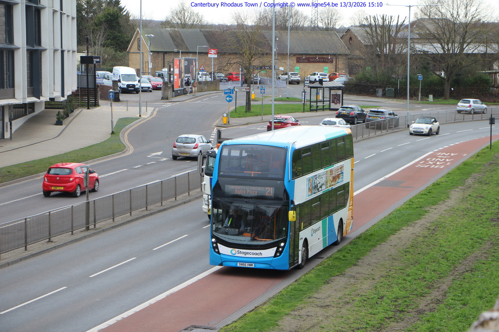 1124. Op 13/3/2026 rijdt de Alexander Dennis Enviro 400 MMC nr. 10722 van Stagecoach South East op lijn 21 naar Canterbury's St Dunstan's Hales Place langs de wallen van Canterbury.