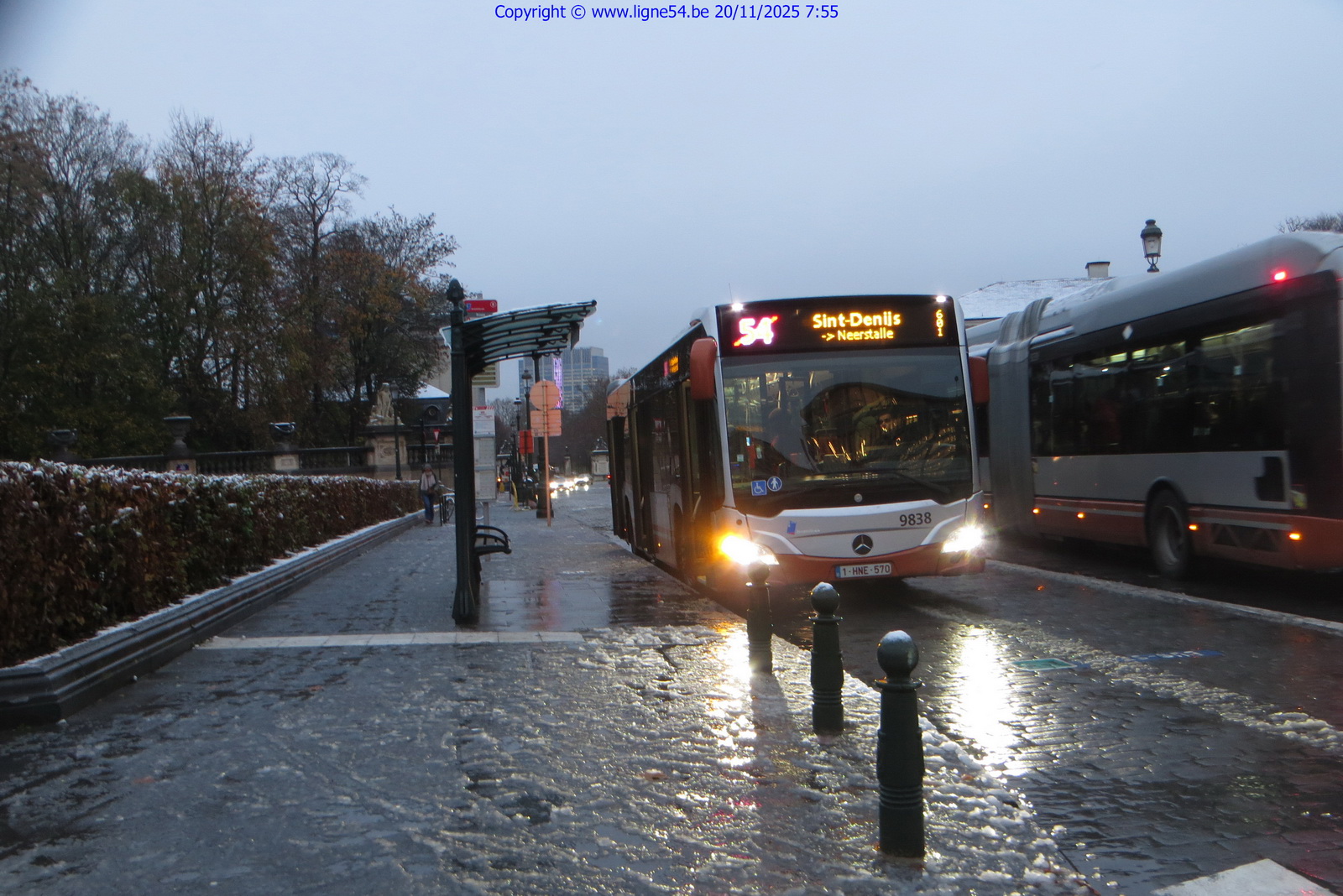 1108. Le 20/11/2025, le Mercedes Citaro C2 n°9838 de la STIB sur la ligne 54 vers Neerstalle dessert l'arrêt Trône.