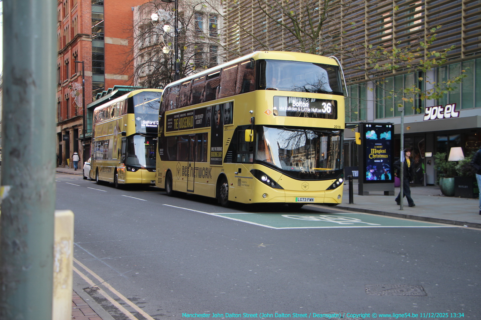 1111. Op 11/12/2025 rijdt de Alexander Dennis Enviro 400 / BYD D8UR-DD nr.2018 van Bee Network / Go North West op lijn 36 naar Bolton op de straten van Manchester.